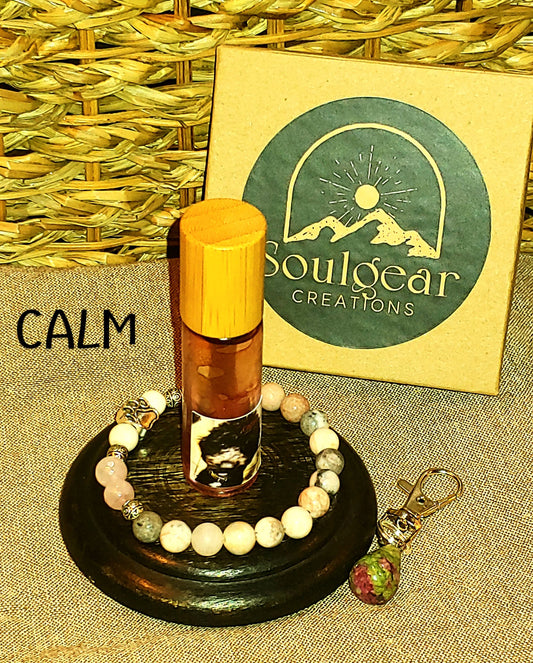 DOGS RULE! PET CALM/ANXIETY Healing Gemstone set- Zebra Jasper, Rose Quart bracelet w/Ruby Zoisite pendant & calming Valerian oil for your dog