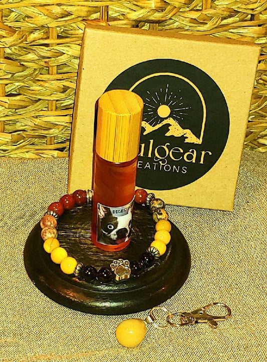 DOGS RULE! PET DIGESTION Healing Gemstone set- Mookaite, Leopardskin Jasper, Smoky Quartz bracelet, Quartz Pendant & Gingerroot oil for your dog