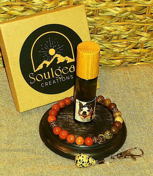 DOGS RULE! PET SKIN Healing Gemstone set- Picasso/ Red River Jasper & Smoky Quartz bracelet with Dalmation Jasper Pendant, Frankincense Dog Oil