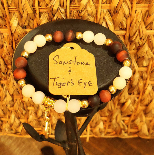GEMSTONE BRAVERY Intention genuine healing bracelet SET of Tiger's Eye & Sunstone, 8mm beads, gold spacers,Lotus charm, 20 dollars each