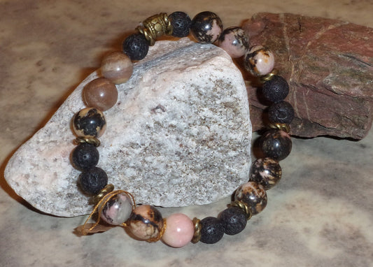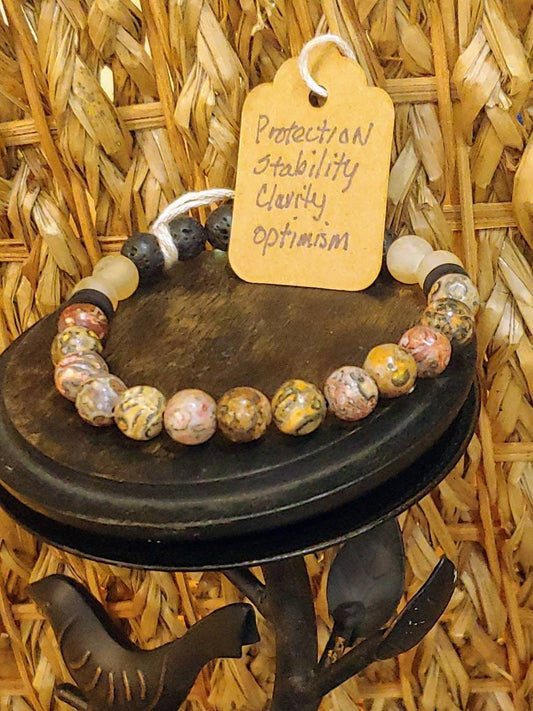 GEMSTONE LIFE'S JOURNEY genuine Crystal healing bracelet of Leopardskin Jasper & Lemon Quartz along with Lava Stone strung on 8mm beads
