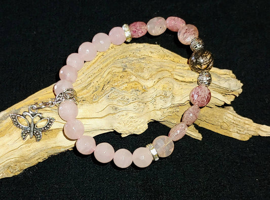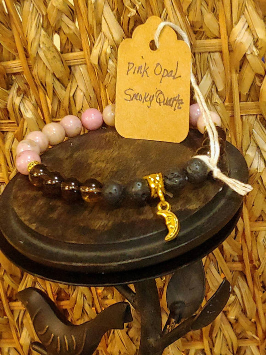 GEMSTONE LOVE Intention Genuine Crystal healing bracelet of Pink Opal & Smokey Quartz, 8mm beads, gold New Moon charm, gold spacers