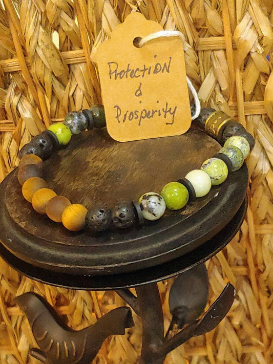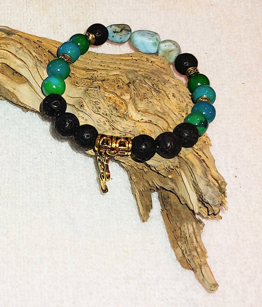 GEMSTONE ENCOURAGEMENT 8mm Bracelet Ancient Stones genuine crystal healing of Chrysoprase & Tiger's Eye, black Lava stone strung w/8mm beads