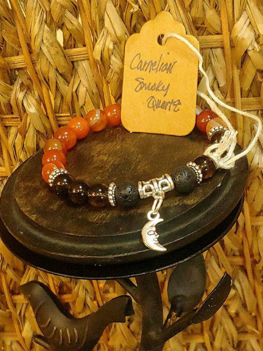 GEMSTONE HEALTH Intention Genuine Crystal healing Gemstone bracelet of Carnelian & Smokey Quartz, 8mm beads, silver spacers and silver new moon charm