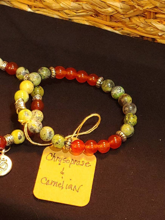 GEMSTONE FERTILITY Intention genuine healing Gemstone bracelet SET of Chrysoprase & Carnelian- 20 dollars each,gold spacers and OHM charm, 8mm beads