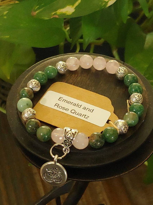 GEMSTONE PATIENCE/UNDERSTANDING Intention genuine healing bracelet SET of African Emerald & Rose Quartz, 8mm neads, silver spacers,Ohm charm