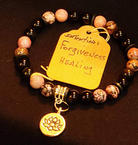 GEMSTONE FORGIVENESS Intention genuine healing bracelet SET with Rhodanite & Black Obsidian, 8mm beads, gold spacers/Lotus-20 dollars each