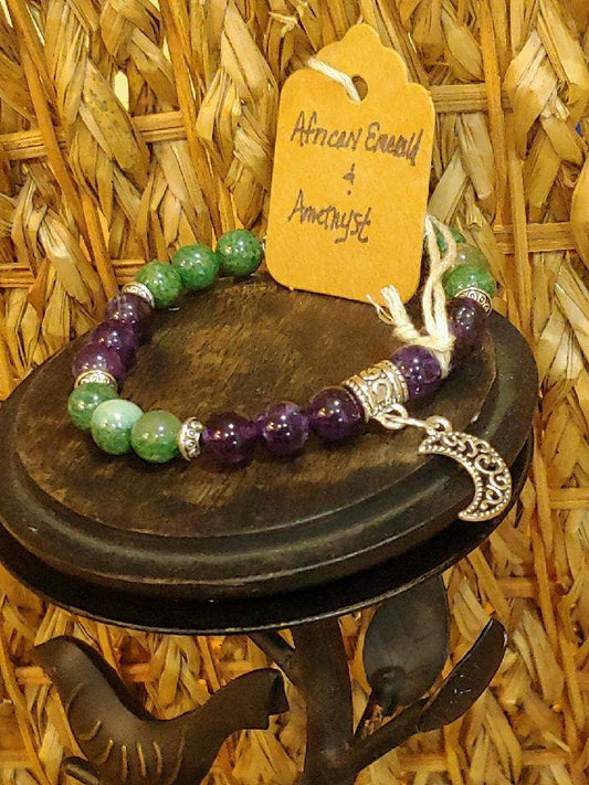 GEMSTONE PROSPERITY Intention Genuine Crystal healing bracelet of African Emerald & Amethyst - 8mm beads- silver charm and spacers