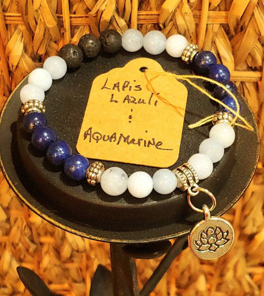 GEMSTONE SPIRITUAL ENLIGHTENMENT genuine healing Gemstone bracelet SET of Lapis Lazuli & Aquamarine, 8mm, gold spacers/Lotus charm-20 dollars each
