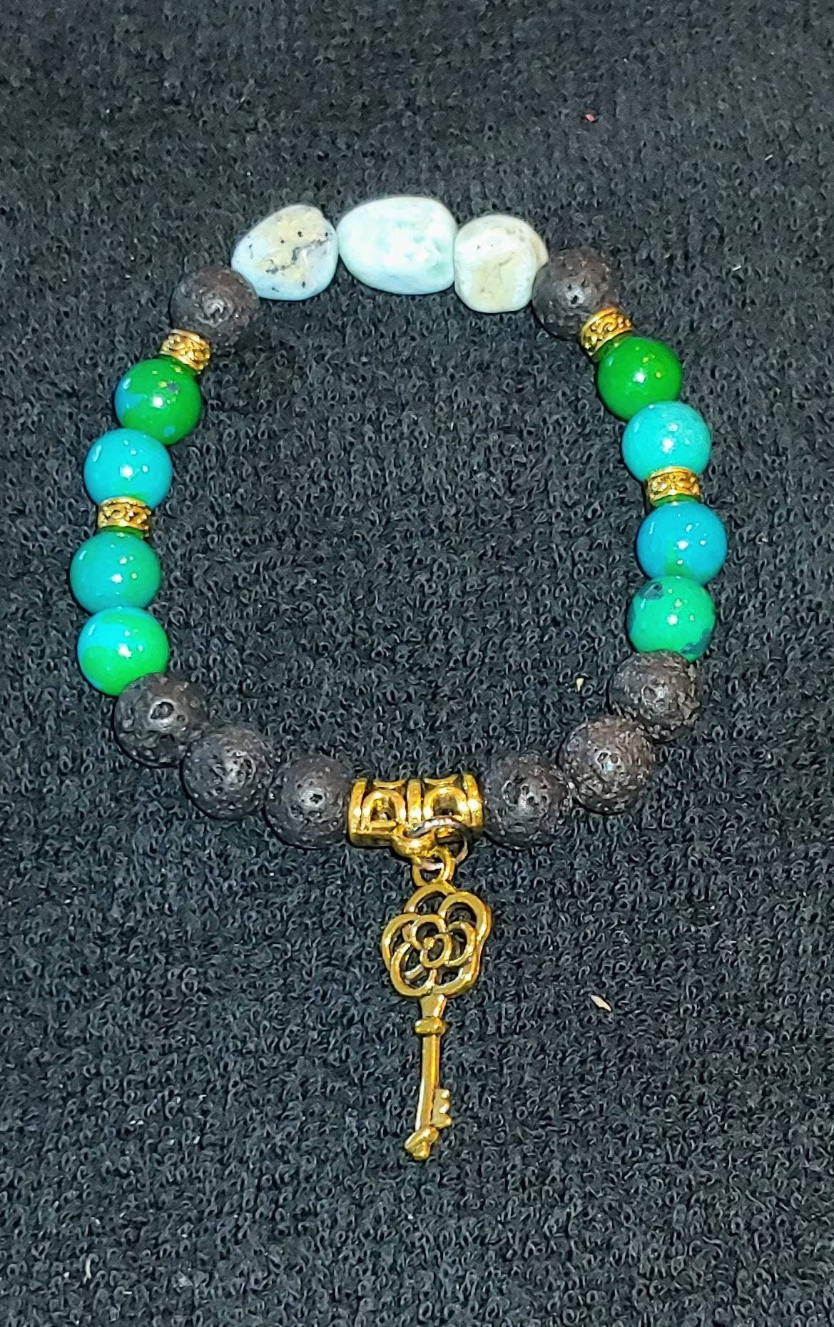 Heal your inner child !! Native American healing stone (chrysocolla) strung along side 3 polished pieces of larimar ..The Stone of Atlantis whose appearance was predicted by Edgar Cayce the "sleeping prophet"...It eminates an energy that assists wearer infusing new energy and vision...cultivates intuition. Chrysocolla calms,cleanses,renews all chakras and also assists body in detoxification. Bracelet adorned with gold spacers,black lava stone for essential oil application.with a gold key charm...unlock the healing power today!!