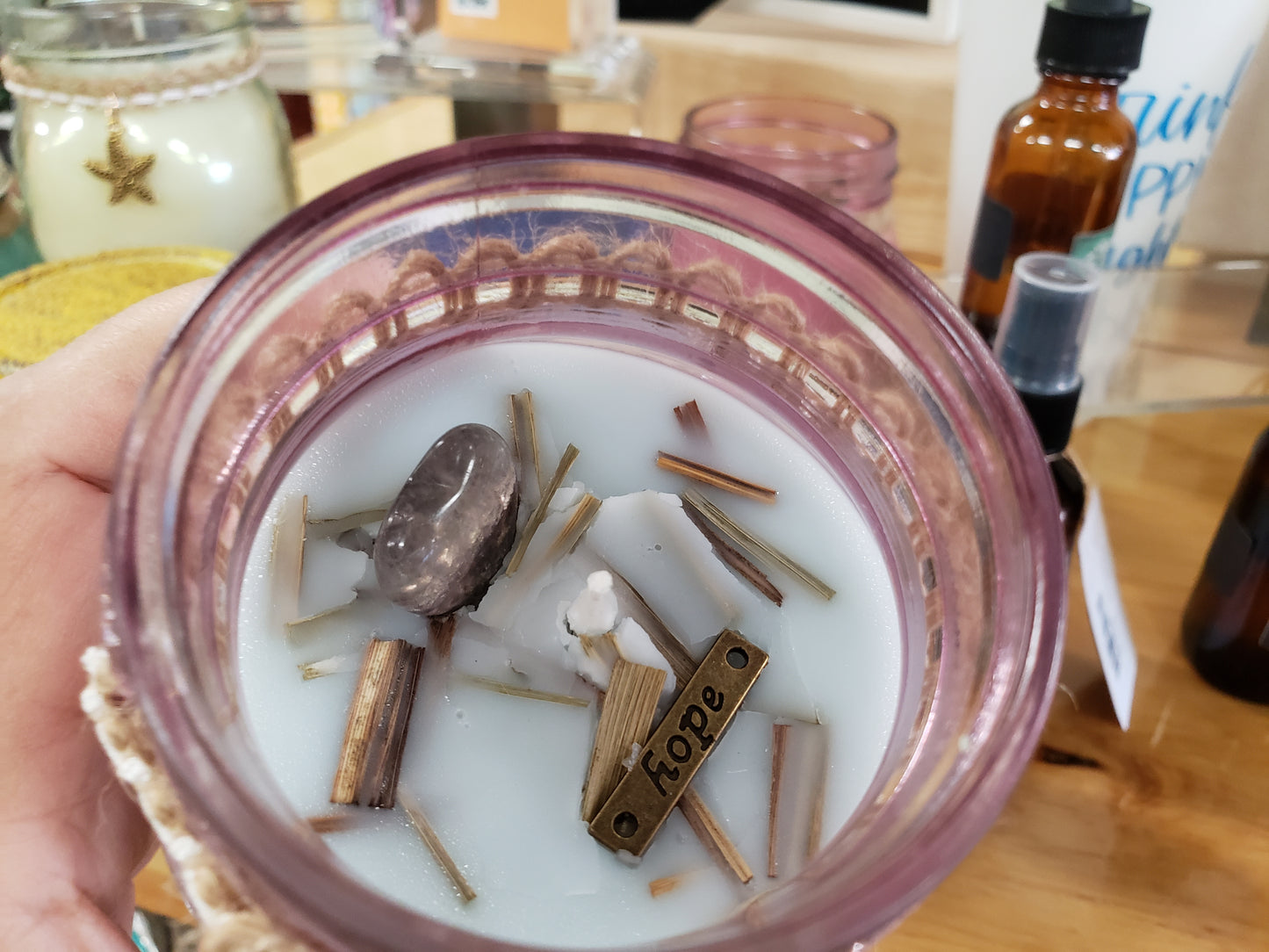 Large glass jar with decorated screw top lid. Summer colors and summer beach scents. Candles wrapped with ribbon and adorned with beach themed charm. Top of candle wax has various crystals and word charm.